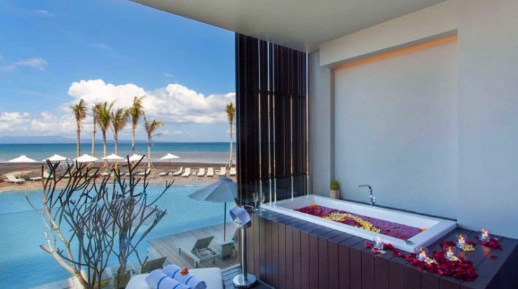 At the gorgeous Wyndham Tamansari Jivva Resort you can relax in style by indulging in soak in the tub while gazing out into the Indian Ocean. This resort offers an absolute beachfront location with stunning volcanic black sands and world class surf breaks just minutes from the resort.